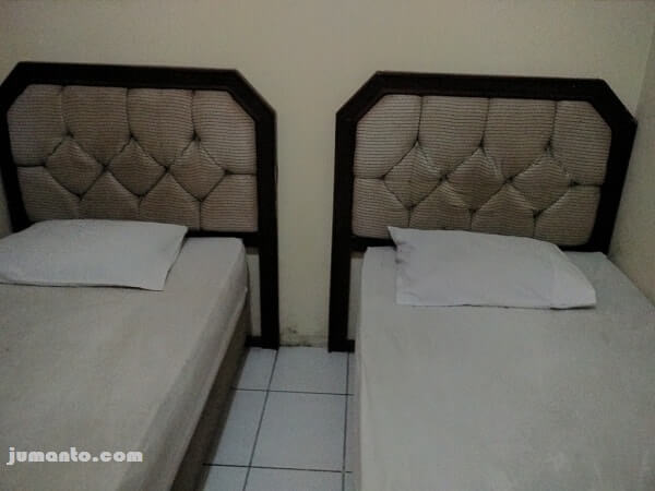 Tempat tidurnya ada dua, jadi kami geser agar jadi satu. Seprai warna putih terlihat sudah banyak bintik-bintik hitam, dan toilet duduknya sudah agak kecoklatan, tidak putih lagi.