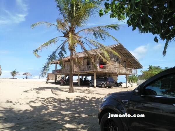 Karena tak ada orang, kami langsung jalan menuju pantai, terlihat ada beberapa orang yang habis menginapan di penginapan kayu yang ada di resort ini.